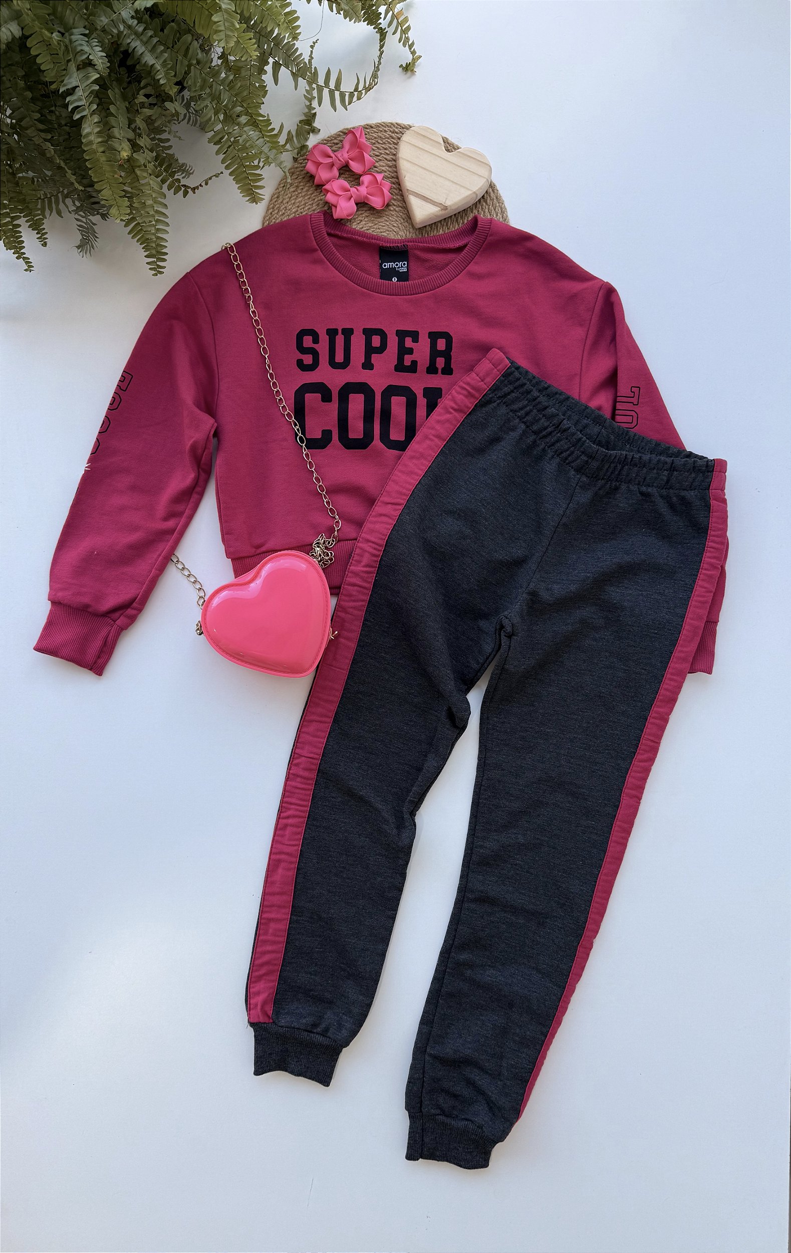 Conforto e estilo para o dia a dia! Esse conjunto é composto por uma blusa em moletinho , com estampa frontal “SUPER COOL” e detalhe em coração metálico. A calça jogger também em moletinho possui faixa lateral combinando com a blusa, além de cós e barra com elástico para melhor ajuste.