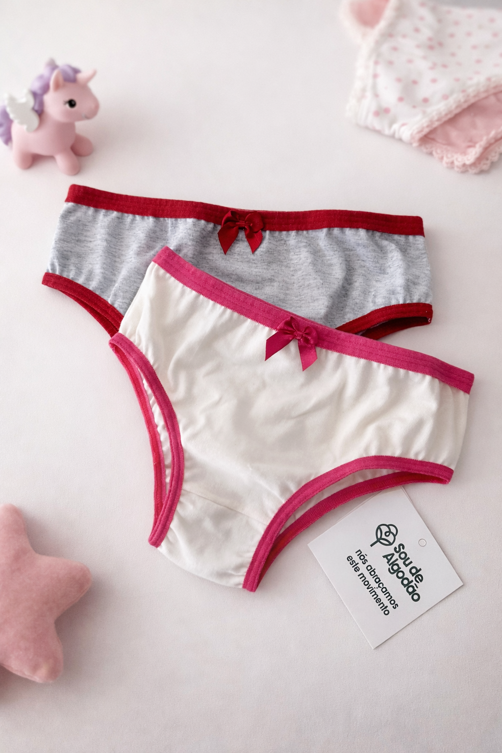 Calcinha infantil foi feita no cotton 98% algodão, com elástico suave, macio e boa elasticidade é ideal para pele delicada das crianças, seu fundo é forrado com tecido 100% algodão. No kit você esta adquirindo 2 calcinhas do mesmo tamanho com cores diferentes .
